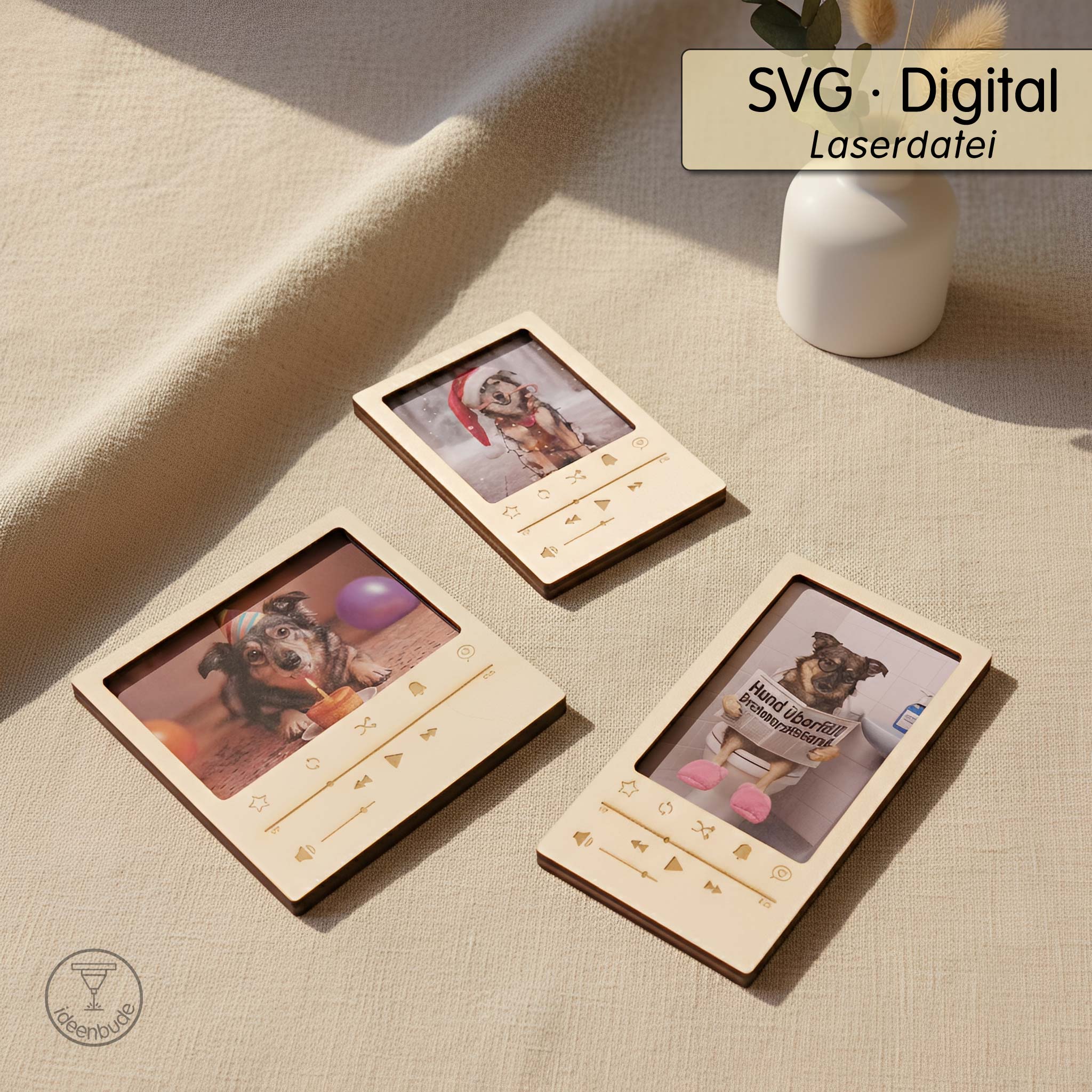 Mit dieser kreativen Laservorlage fertigst du ein modernes 3er Set Bilderrahmen im stylischen Musikplayer-Look.