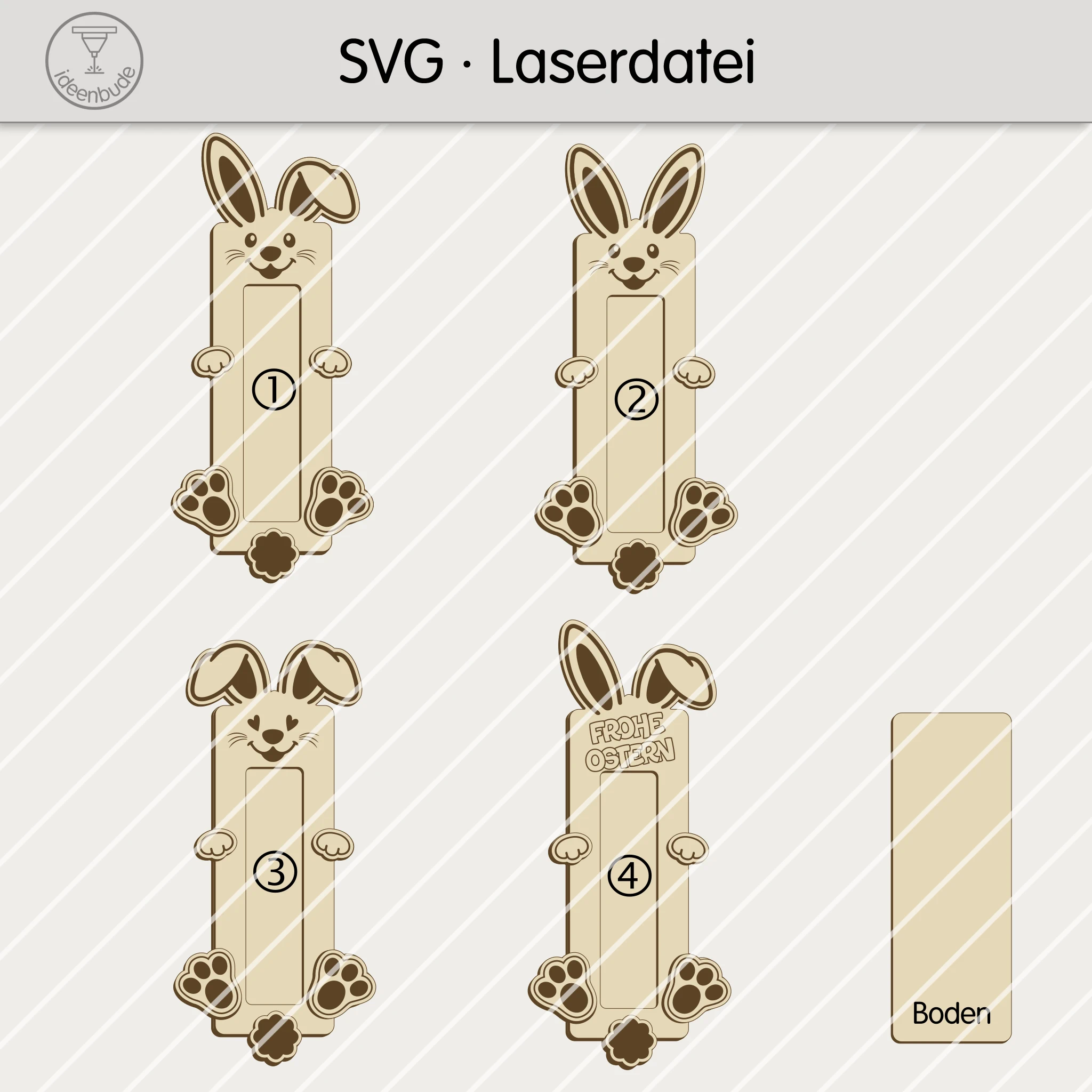 Mit dieser liebevoll gestalteten Laservorlage zauberst du im Handumdrehen einen niedlichen Hasen-Geschenkhalter. Perfekt geeignet, um Schokoriegel stilvoll zu verpacken und mit einer Schleife zu fixieren – ideal als kleines Mitbringsel zu Ostern 🐣